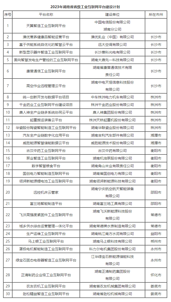 為深入開展“智賦萬(wàn)企”行動(dòng),持續(xù)建設(shè)省級(jí)工業(yè)互聯(lián)網(wǎng)平臺(tái)體系,加快企業(yè)數(shù)字化轉(zhuǎn)型,打造國(guó)家重要先進(jìn)制造業(yè)高地,經(jīng)企業(yè)申報(bào)、市州推薦、現(xiàn)場(chǎng)答辯、專家評(píng)審等程序,省工信廳同意天翼智造工業(yè)互聯(lián)網(wǎng)平臺(tái)等30個(gè)項(xiàng)目列入2023年湖南省省級(jí)工業(yè)互聯(lián)網(wǎng)平臺(tái)建設(shè)計(jì)劃,現(xiàn)予發(fā)布。