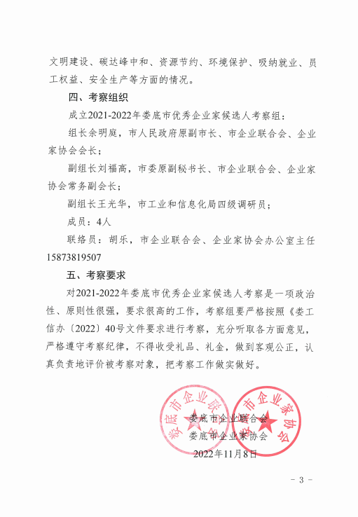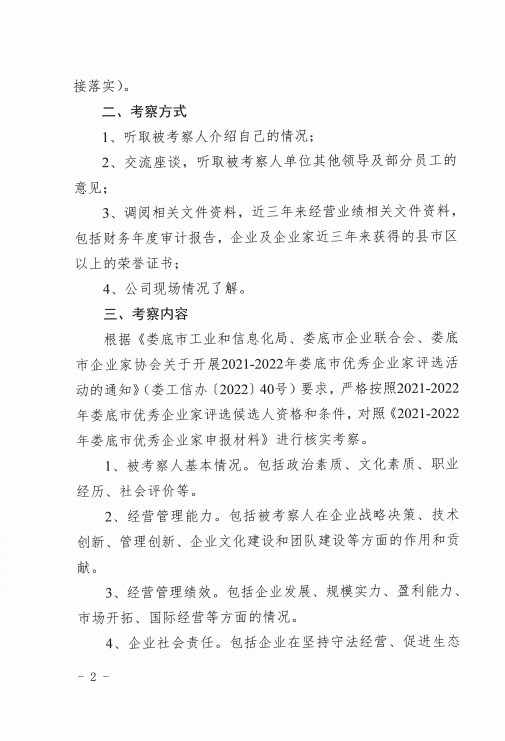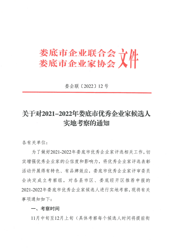 關(guān)于對2021-2022年婁底市優(yōu)秀企業(yè)家候選人實(shí)地考察的通知