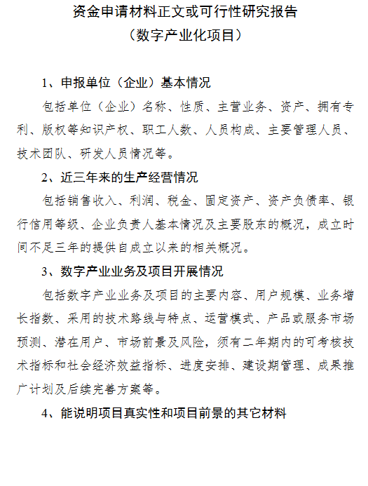 (1)數(shù)字產(chǎn)業(yè)化項目。主要支持互聯(lián)網(wǎng)、軟件和信息服務等服務業(yè)和電子信息制造、企業(yè)信息化建設等制造業(yè)企業(yè)項目;