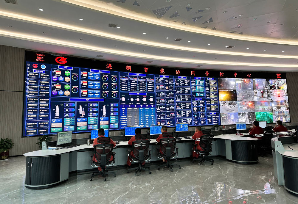 在漣鋼智能協(xié)同管控中心,LED屏幕上躍動(dòng)著煉鋼環(huán)節(jié)的各項(xiàng)數(shù)據(jù)參數(shù)和生產(chǎn)一線的實(shí)時(shí)畫面,技術(shù)工人正在監(jiān)測(cè)分析生產(chǎn)動(dòng)態(tài)信息。