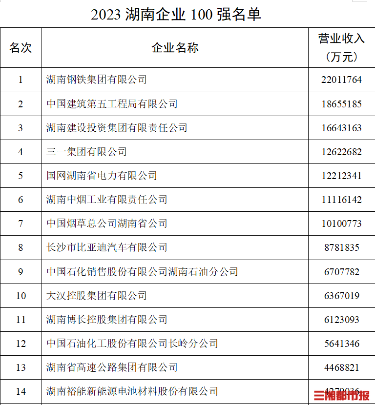 在2023湖南制造業(yè)企業(yè)100強(qiáng)名單中,湖南鋼鐵集團(tuán)有限公司、三一集團(tuán)有限公司、湖南中煙工業(yè)有限責(zé)任公司居前三名,后兩家公司的營(yíng)收分別為1262億元和1112億元。在2023湖南服務(wù)業(yè)企業(yè)50強(qiáng)名單中,國(guó)網(wǎng)湖南省電力有限公司、中國(guó)煙草總公司湖南省公司、中國(guó)石化銷售股份有限公司湖南石油分公司分別以1221億元、1010億元、670億元的營(yíng)收排名前三。
